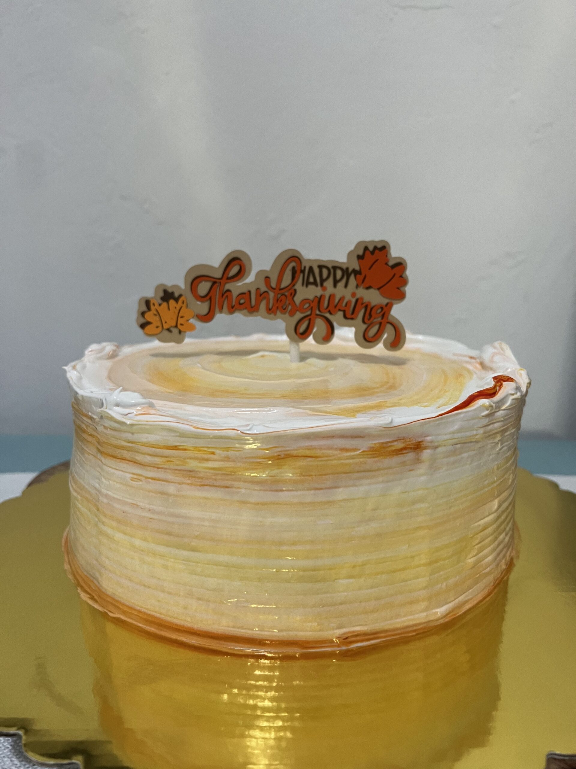 8 inch vanilla cake with a choice of filling decorated on buttercream and Thanskgiving cake topper.